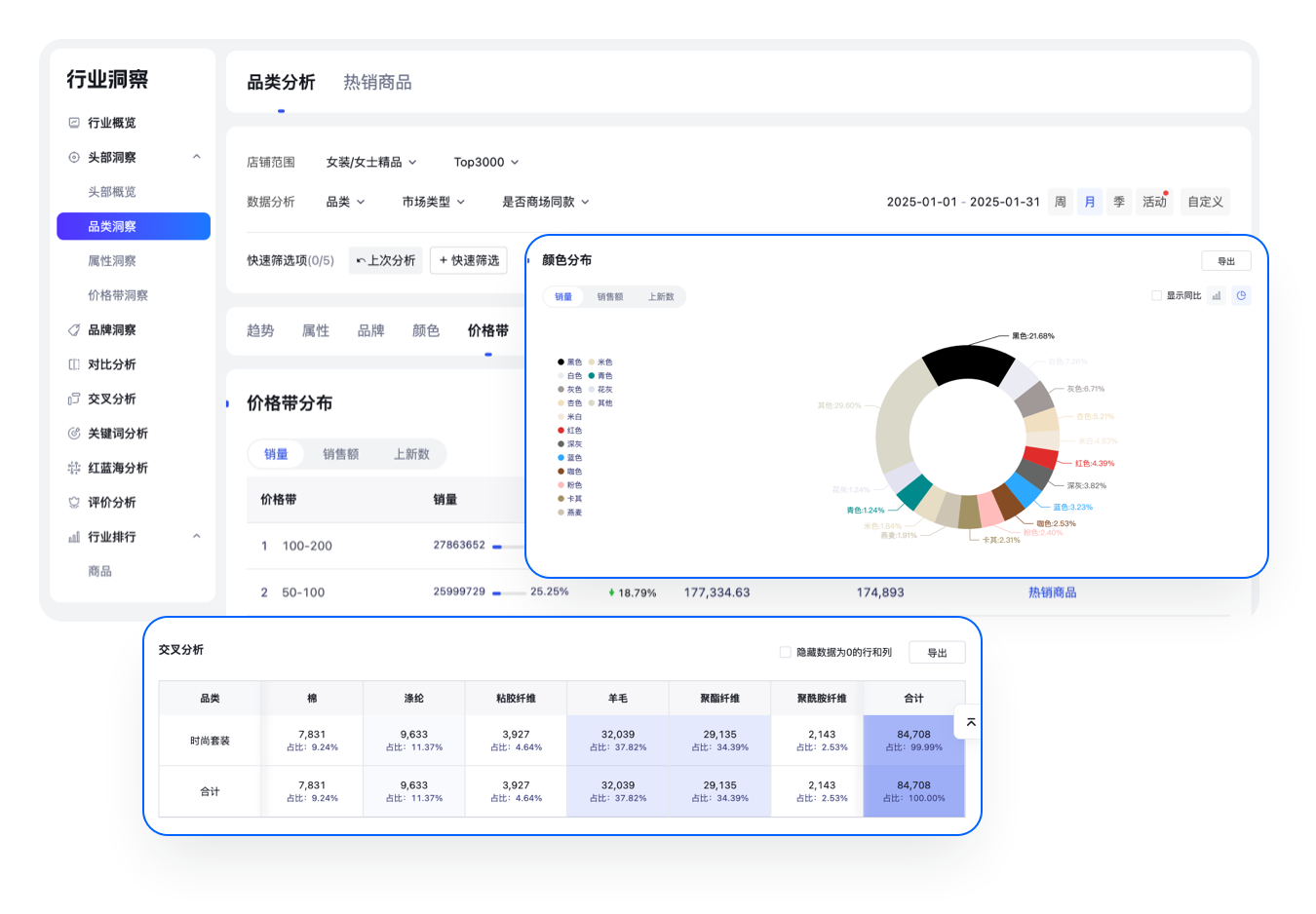 基于销量、上新、收藏等淘系电商数据,呈现目标市场的品类结构、价格趋势、颜色及面料分析等属性分析。支持多维度交叉分析,发现细分领域下的热销爆款。