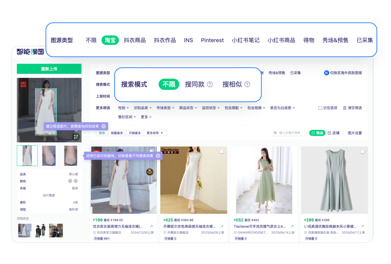 支持在淘系、抖音、INS、小红书及得物等多平台搜索同款及相似款,全面提升找款效率。