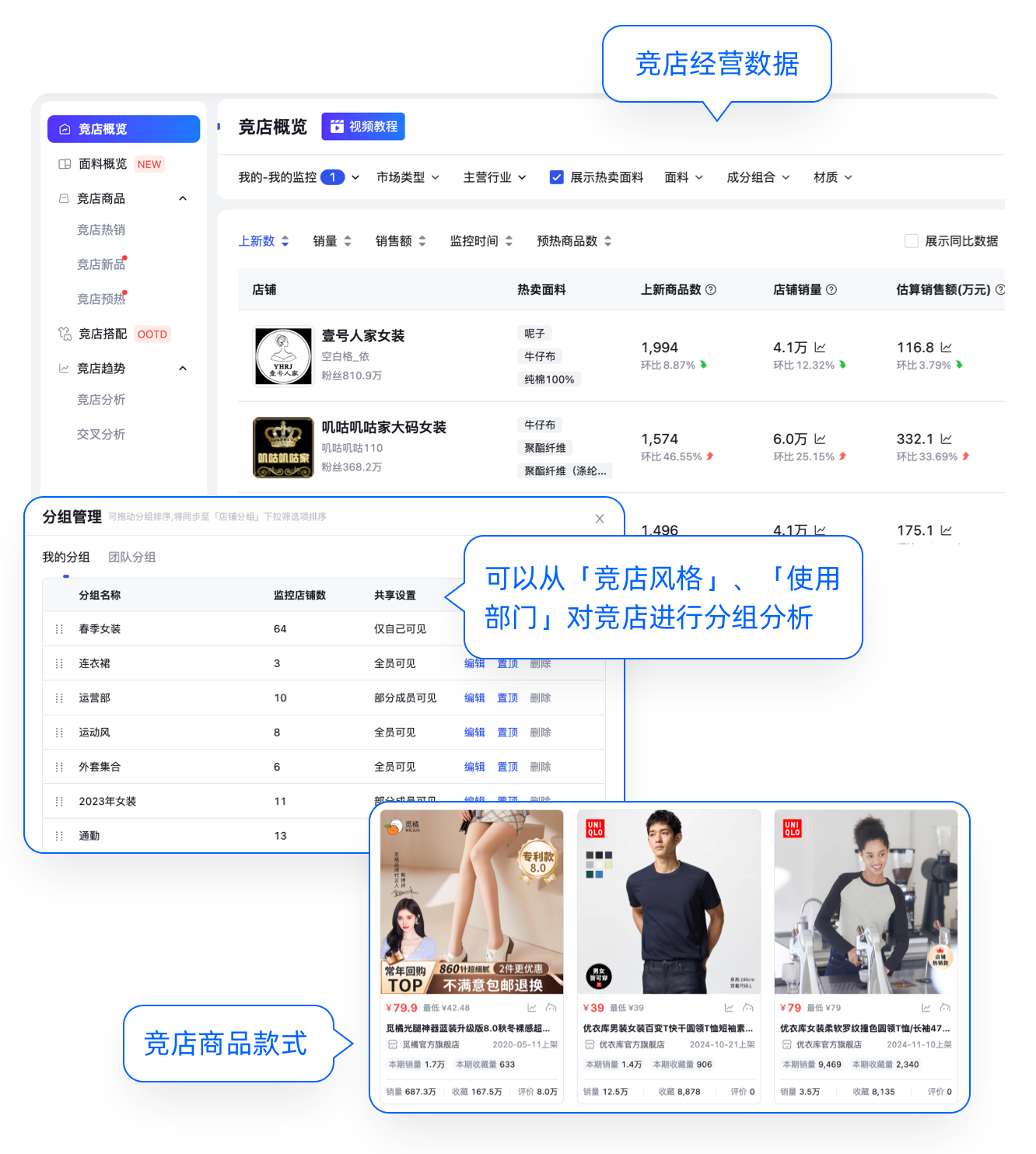 基于店铺和商品的销售数据,从品类、价格及属性等多维度分析竞品店铺与商品销售趋势,提供营销及口碑分析,全面了解竞争对手动态。